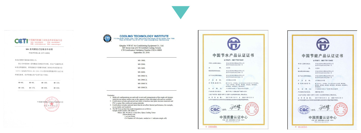 沃斐特拥有检测技术完善的检测研发中心,并建立了一套完善的质量检测体系,分别通过了国家玻璃钢制品质量监督检验中心检测,中中用机械协会冷却设备分会CCTI、美国冷却塔行业协会CTI以及中国质量认证中心节能节水产品认证。