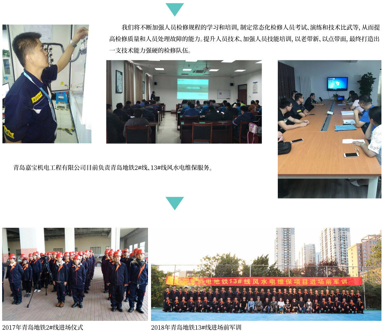 青岛嘉宝机电工程有限公司地铁风水电维保项目部拥有180人专业技术人员,他们都是机电相关专业的大学生和一些多年从事风水电专业的工程师,他们不怕苦不怕累,风雨无阻,365天全天24小时对风水电设备进行保障,2018年仅青岛地铁2#线维保队伍就完成了86099项检修任务。他们经历了春节、峰会等重大节日和活动,确保在节日和重大活动期间地铁风水电专业设备正常运行不出差错。